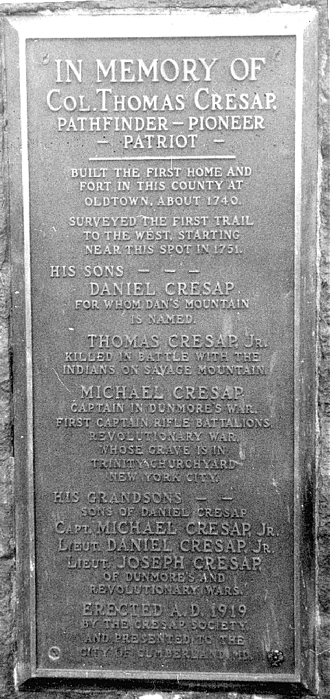 Colonel Cresap had five children. Three were sons Thomas, Daniel, and Michael, born in that order. He also had two daughters Sarah and Elizabeth. His sons also played an important role in the settling of western Maryland.