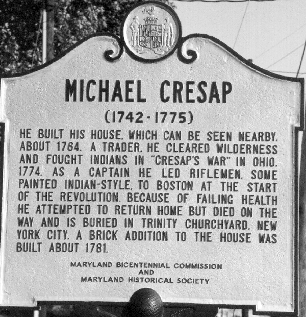 Cresap's sandstone monument can still be seen in Trinity Churchyard. It bears the following inscription: "In Memory of Michael Cresap/First Captain of the Rifle Battalions, and/son of Colonel Thomas Cresap who departed/this life October the 18th 1775".