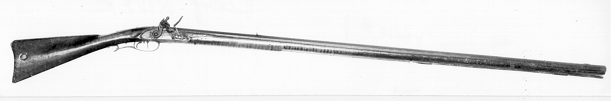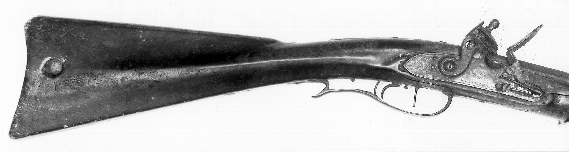 There is no rear entry pipe, although the mouth of the hole has been enlarged to a funnel shape to readily accept the rarod. The two ramrod pipes are made of copper. There is no nose cap. The termination of the stock at the muzzle is formed in a shape similar to that found on early English fowling pieces.