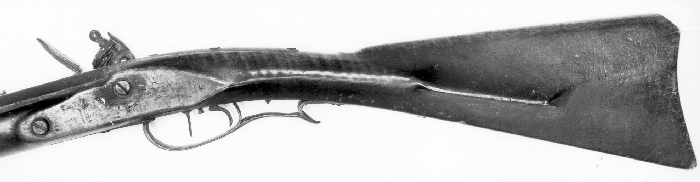 There is no side-plate. The mouth of each lock-bolt hole is reinforced with a brass washer. Directly behind the rear extension of the trigger guard are two holes; one has been plugged with a wooden splinter. Most collectors insist that these holes held vent picks make from turkey quills, but they may have been made by screws or nails that held one end of a makeshift sling. The other end of the sling would have been a simple loop around the barrel of the rifle. Many early hunting rifles of Teutonic origin used fabric slings fastened to the stock on metal button-headed" screws threaded into the belly of the stock in the same area as the holes on this rifle. Whatever their purpose, the holes are seen quite often on Southern longrifles.