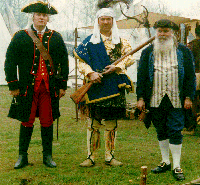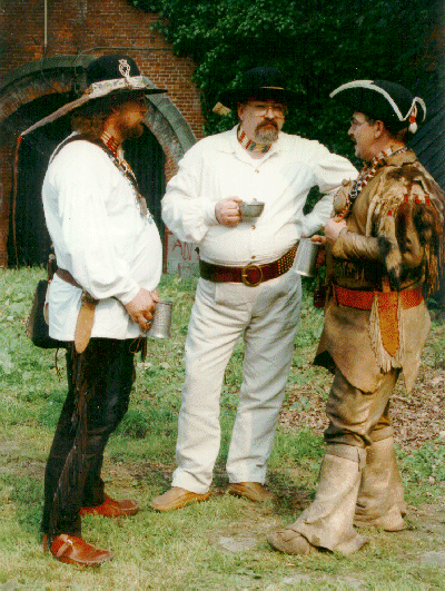 Texas City (Belgium), Easter 1995: White Wolf, Seneca warrior, flanked by French Marquis Mark Marie Martin de Sans Careaux, Vicomte de Villers, Seigneur de Marbais (yes, his full name is quite a mouthful. . . ) and his faithful servant, Remy.