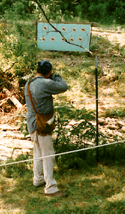 First of all, it out to be an exercise in marksmanship. It should give you practice shooting at different, and unknown, ranges at targets of different sizes and shapes. It is a good idea to require shooting from different positions, too. In short, it should emulate as much as possible the shots that one would take under actual hunting conditions. Shooting through a ring to hit a clanger imitates shooting through a hole in the brush to place your ball properly on game. A ball-split, tack-drive or card-cut requires the steadiness and fine hold needed in "barking" a squirrel.