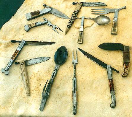 NMLRA Field Rep. and blacksmith Tom Muschlitz of The Mountain Forge (1561 Skeet Club Rd., High Point, NC 27265; see his Muzzle Blasts ads) makes many fine folding utensils for trekkers and rendezvous devotees. He's noted for his Revolutionary period folding frying pan, and has introduced a series of individually crafted folding knives and eating utensils.