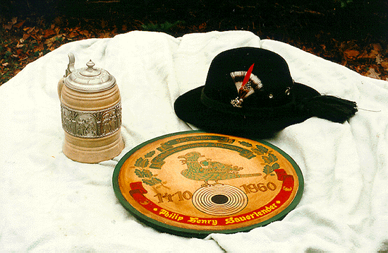 In Attendorn I met a Mr. Dieter Weiss who owns a gift shop. He is an active shooter and paints wooden ceremonial targets for the Schuetzen Clubs. He had a number on display. They range from the traditional designs to one honoring the U.S. Cavalry (American Westerns are very popular on German TV--You should hear John Wayne in German!). He sold me one which he had made to honor the 550th anniversary of the Schuetzengesellschaft Attendorn. It was on display since the person it was made for had died before he could pick it up. Mr. Weiss insisted that he paint my full name in the place where the winner of the target would have been honored. This was a real treat, since there is a good chance that some of my ancestors were members.