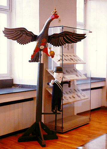 I have enclosed pictures of the Eagle which is shot during festivals. Mr. Weiss said that it is called the Koenigsvogel [king's eagle]. He said it is patterned after the German Imperial Eagle. Various parts of the wooden target are designed to fall off when hit. It is perched high up in the air and shot at from a distance of about 25 meters. It was never very clear what was used to shoot it. One person said a crossbow, another a .22 cal. rifle, and some pictures showed something looking like a small-bore shotgun. My favorite was a cartoon showing a member shooting Deutchmarks at the target! Mr. Weiss said that, in order, members shot off the crown, the orb, the scepter, the left wing, the right wing, and finally, the body. Obviously, this has roots in the protest against the Prussians: they first knock off the symbols of authority, wing the Prussian Eagle, and then kill it!