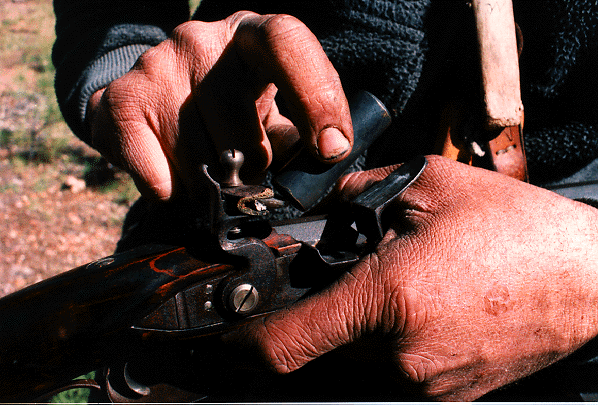 A word of caution: NEVER, NEVER test the sparking of a new or sharpened flint on a loaded gun, even if there is no prime in the pan. More than once I have seen rifles go off when a spark hits the touch hole.