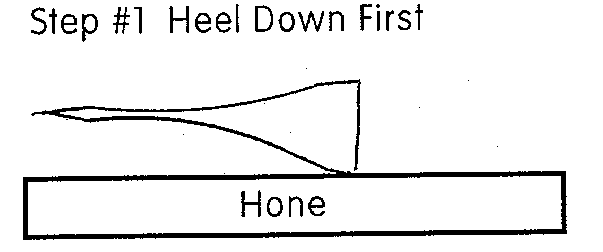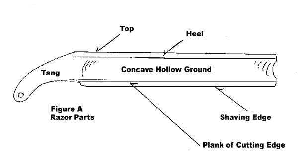 You must know the parts of your straight razor to be able to understand the sharpening instructions. (See figure A). Place the heel of the razor on the hone first, keeping the shaving edge up off of the hone. Now lay the plane of the cutting edge on the hone; the razor is now flat on the hone. The sequence of heel first, then the shaving edge keeps you from ever chipping the shaving edge of the razor. It also keeps you from creating a compound angle on the cutting edge.